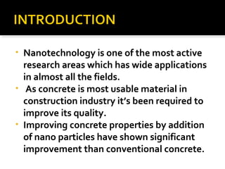This document discusses the use of nanotechnology to improve the properties of concrete. It describes how the addition of nano-particles like carbon nanotubes, nano-silica, and polycarboxylates can enhance qualities such as strength, workability, and curing time. These nano-additives fill pores, improve bonding, and increase viscosity. Concrete mixed with such nanomaterials requires less water and curing time while achieving greater strength and durability. The document also reviews the properties and effects of specific nanomaterials used to reinforce concrete.