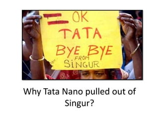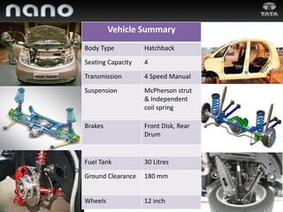 Tata aims to develop its car brand in India with innovative and superior value vehicles. Its key product is the Nano, a low-cost small car priced at 100,000 rupees. The Nano is compact at 3.1 meters long and weighs 600 kg. It gets 20 kmpl mileage and has a 623cc engine. Tata promoted the Nano through word of mouth and media coverage of its low price point. However, its plant was moved from West Bengal to Gujarat due to political issues. Tata was offered various incentives from states seeking the new factory.