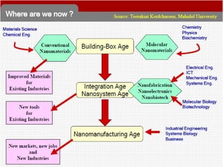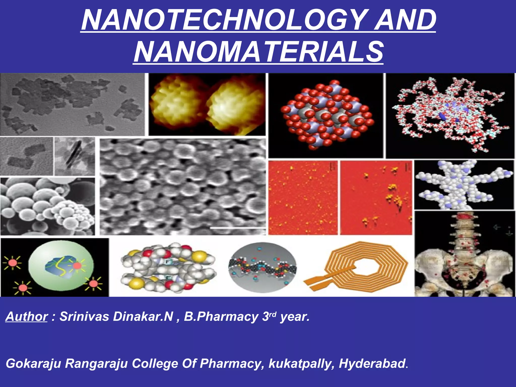 This document discusses nanotechnology and nanomaterials. It summarizes that nanotechnology involves controlling matter on an atomic and molecular scale. Nanofluids are suspensions of nanometer-sized particles in a base liquid that exhibit special properties relative to bulk materials like high thermal conductivity. Nanofluids are characterized using techniques like electron microscopy and dynamic light scattering. Common fabrication methods for nanofluids include attrition, pyrolysis, and inert gas aggregation. Nanofluids show promise for applications in industries like electronics and healthcare but also have safety and characterization challenges that require further development.
