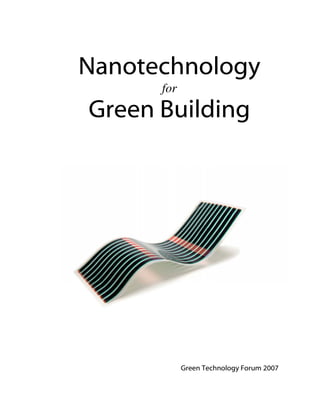 This document provides an overview of the potential for nanotechnology to advance green building goals through new materials and products. It finds that nanotechnology can significantly reduce energy use, waste, and pollution from buildings. Current applications include insulating and self-cleaning nanocoatings. Near-future applications include nano-enhanced solar cells, lighting, and air/water filtration. More distant applications may include nano-enhanced structural materials. The document outlines a three-phase timeline and estimates the nanotechnology market in building will grow from less than $20 million currently to nearly $400 million by 2016. It also discusses drivers, obstacles, and future trends regarding the use of nanotechnology in green building.