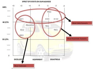 The document provides an analysis of introducing Tata's Nano car into the US market. It begins with an introduction to Tata and its international presence. It then performs a SWOT analysis and identifies political, economic, social, technological, and competitive factors that could impact Nano's entry. Three scenarios are mapped out - Oasis (optimistic), Nostradamus (most likely), and Curse of Blossom (pessimistic). Competitors are analyzed for each scenario. The point of difference, brand image, product features, and pricing strategy are proposed for each scenario.