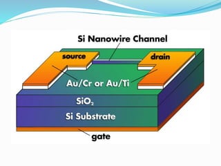 Nanotechnology allows for smaller transistors, memory, and circuitry in electronics by building components at the nanoscale. Moore's Law describes how the number of transistors on a chip doubles every two years. Instead of assembling larger transistors, nanoscale transistors are grown together on silicon wafers. This has increased computer processing speed while decreasing costs. Nanotechnology also enables far smaller and cheaper computer memory storage. It could allow 1000GB of memory to fit on a pinhead. It is used in transparent electrodes for thin, clear displays. Electron microscopes are needed to view nanoscale circuits.