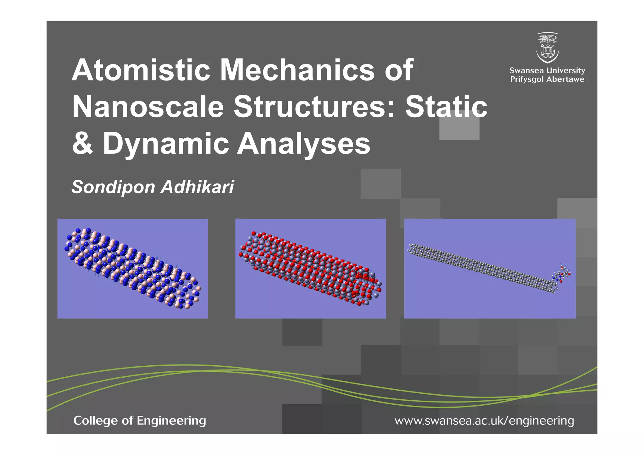 The document discusses the atomistic mechanics of nanoscale structures, focusing on static and dynamic analyses of materials like carbon nanotubes, fullerenes, and graphene. It details methodologies such as the atomistic finite element method and explores various research areas including the mechanical properties of nanoscale objects and bio sensors. The findings include analyses of vibration spectra, buckling mechanisms, and the impact of defects on the mechanical properties of carbon nanotubes.