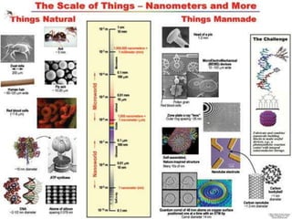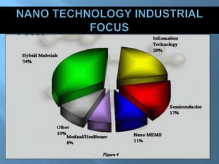 The document discusses the history and applications of nanoscience and nanotechnology. It notes that while the core concepts date back to the 1950s, the field has grown rapidly in recent years. Some key applications mentioned include using nanomaterials for medical diagnosis and drug delivery, water purification, toxicity detection, and to improve display and audio devices. Nanotechnology is also being used and explored in chemistry, defense, and other fields, but it remains an expensive technology with potential pollution and health risks due to the small size of nanomaterials.