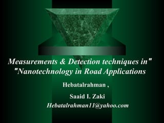 This document discusses the advancements in nanotechnology measurement and detection techniques, focusing on their applications in the construction industry. It highlights various tools like nano indentation, atomic force microscopy, and scanning tunneling microscopy, examining their operation and accuracy in evaluating nanomaterials. The work emphasizes the need for advanced detection systems and recommendations for utilizing these technologies to improve construction processes and material properties.