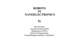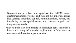 This document discusses nanorobots and their potential applications in medicine. It describes how nanorobots could function as artificial red blood cells (respirocytes), white blood cells (microbivores), and platelets (clottocytes). Respirocytes could carry oxygen throughout the body more efficiently than natural red blood cells. Microbivores could break down pathogens through phagocytosis faster than the immune system. Clottocytes aim to complete hemostasis, or blood clotting, within one second compared to minutes for the natural process. Overall, the document outlines how nanorobots may be used for targeted drug delivery, disease detection and treatment, and performing delicate surgeries at the micro and nano