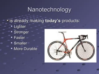 Nanotechnology involves controlling and modifying matter at the atomic and molecular scale, between 1 to 100 nanometers. It deals with developing and changing materials and devices at the nanoscale. Nanotechnology is already making today's products lighter, stronger, faster, smaller and more durable. It involves simulations like molecular dynamics to study molecular behavior and interactions at the atomic level. Current applications include wound dressings, water filtration, paints and coatings. Future uses may include advanced computers, solar cells, and tissue regeneration.