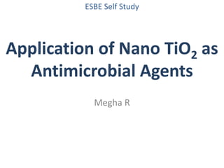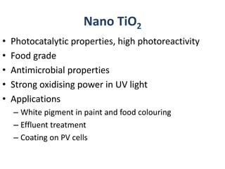 This document discusses the application of nano TiO2 as an antimicrobial agent. Nano TiO2 has photocatalytic and antimicrobial properties and can be used as a food-grade pigment, in effluent treatment, and to coat photovoltaic cells. It acts against both gram-positive and gram-negative bacteria as well as fungi by inhibiting bacterial growth, degrading cell walls, and damaging DNA. Potential applications include use in food packaging to extend shelf-life, coating on polymers and paints for antimicrobial surfaces, and in self-cleaning coatings by breaking down dirt and organic materials photcatalytically. Upon absorbing light, nano TiO2 generates reactive oxygen species that act as powerful oxid