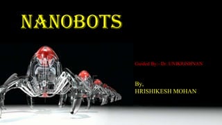 This document summarizes nanobots, which are hypothetical self-propelled nanoscale machines that can perform tasks at the nanoscale. It discusses their potential design based on bacteria flagella, with components like sensors, motors, and power sources. Applications proposed include fighting cancer by targeting and destroying cancer cells, treating blood diseases by regulating white blood cell count, and performing gene therapy by replacing defective genes. While nanobots could revolutionize medicine, concerns exist around potential toxicity, replication getting out of control, and the challenges of accuracy and maintenance at the nanoscale. The document provides references and citations for further information.