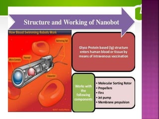 Nanobots are microscopic machines that can operate inside the human body. They have potential applications in medicine such as targeted drug delivery, breaking up blood clots and kidney stones, gene therapy, and fighting cancer. Nanobots may one day help cure diseases by performing tasks at the nano scale. While nanobots offer advantages like rapid treatment and low costs, challenges remain around replication control and biocompatibility. Future areas of focus include the central nervous system and more advanced cancer treatments.