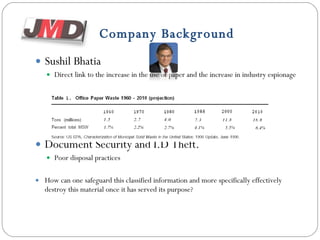 The document discusses a company called Nano DeCopier that developed a machine called the Nano DeCopier to pulp paper and securely destroy documents. It discusses issues the company may face such as the economic downturn, increased competition, and regulations. It evaluates three business options: selling just the machine, providing document destruction as a service, or converting the pulp into new products. Option C of converting the pulp into new products is recommended as being the most financially viable.