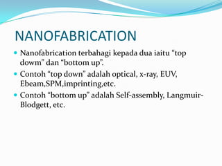 Dokumen ini membahas tentang nanofabrication yang terbagi menjadi dua metode: 'top-down' dan 'bottom-up'. Metode 'top-down' mencakup litografi, pemendapan, dan pengasingan, sedangkan metode 'bottom-up' meliputi kimia pertumbuhan wap dan reaksi sendiri. Terdapat berbagai teknik dan jenis bahan yang digunakan dalam nanofabrication, serta beberapa peneliti awal yang berkontribusi dalam bidang ini.