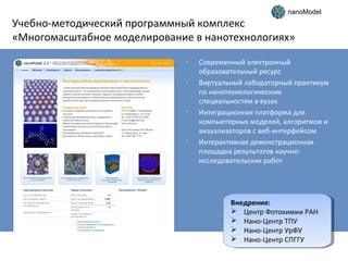Документ описывает виртуальный лабораторный практикум на базе учебно-методического комплекса "многомасштабное моделирование в нанотехнологиях" (nanomodel), разработанный для поддержки образовательных процессов в области нанотехнологий. Комплекс включает онлайн-эксперименты, редакторы параметров, методы моделирования, визуализации и обмена данными, что позволяет проводить исследования нано- и субнано структур. Проект реализован при поддержке федерального агентства по науке и инновациям в рамках целевой программы на 2007-2012 годы.