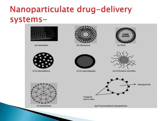 This document discusses nanoparticles and their uses in drug delivery. It defines nanoparticles as particulate dispersions between 10-1000nm in size. Nanoparticles are classified based on their method of preparation into nanocapsules and nanospheres. Some common types of nanoparticles discussed are solid lipid nanoparticles, polymeric nanoparticles, ceramic nanoparticles, and hydrogel nanoparticles. The document outlines advantages like increased shelf stability and ability to control drug release. Evaluation parameters for nanoparticles include particle size, molecular weight and in vitro drug release. Finally, applications like targeted drug delivery to the brain and topical formulations are mentioned.