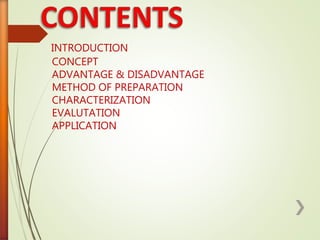 This document discusses nanoparticles for drug delivery. It begins with definitions and concepts, noting that nanoparticles range from 10-1000 nm and can be used to selectively deliver drugs to target sites while reducing effects on non-target tissues. It then covers advantages like reduced dosing and side effects. Methods of preparation include cross-linking and polymerization. Nanoparticles are characterized and evaluated before being discussed for various applications such as cancer therapy, vaccines, and crossing the blood brain barrier.