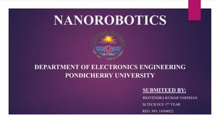 The document discusses nanorobotics and describes various components involved. It provides an overview of nanorobotics, defining it as the technology of creating robots at the nanoscale level. It describes challenges in building nanorobots such as reducing friction and supplying power at the nanoscale. The document outlines the components of nanorobots including sensors, computers, actuators, power sources and how they work together. It discusses different types of nanorobots and techniques for their design and manufacture. Applications of nanorobots in medicine are also mentioned.