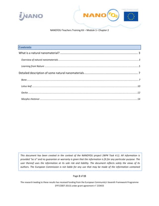 This document discusses natural nanomaterials and provides examples. It defines natural nanomaterials as materials from nature that have remarkable properties due to their inherent nanostructure, without human modification. Some examples of natural nanomaterials mentioned include bone, the lotus leaf, gecko feet, and the wings of the Morpho rhetenor butterfly. The document explains how the nanostructure of these materials allows for properties like self-cleaning, adhesion, and iridescence.