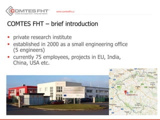 This document discusses nanostructured titanium for use in dental implants developed by COMTES FHT. It summarizes that COMTES FHT uses severe plastic deformation through continuous extrusion and rotary swaging to refine titanium grains down to the nano scale. This nanostructured titanium of grades 2 and 4 achieves higher mechanical properties than commercial grades, with grade 2 reaching properties of grade 4 and grade 5 and grade 4 exceeding grade 5. Nanostructured titanium allows improving dental implant strength and toughness without compromising biocompatibility.