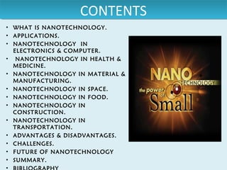 This document provides an overview of nanotechnology, its applications, opportunities, and challenges. It discusses how nanotechnology can be applied in electronics, medicine, materials, food, space, transportation, and other industries. Some key opportunities include developing new drug delivery methods, lighter stronger materials, more efficient solar cells and batteries. Challenges include safety concerns over particle inhalation, high costs, and ensuring benefits are realized. The future of nanotechnology remains uncertain but it could help solve major problems if developed responsibly with consideration for its societal impacts.