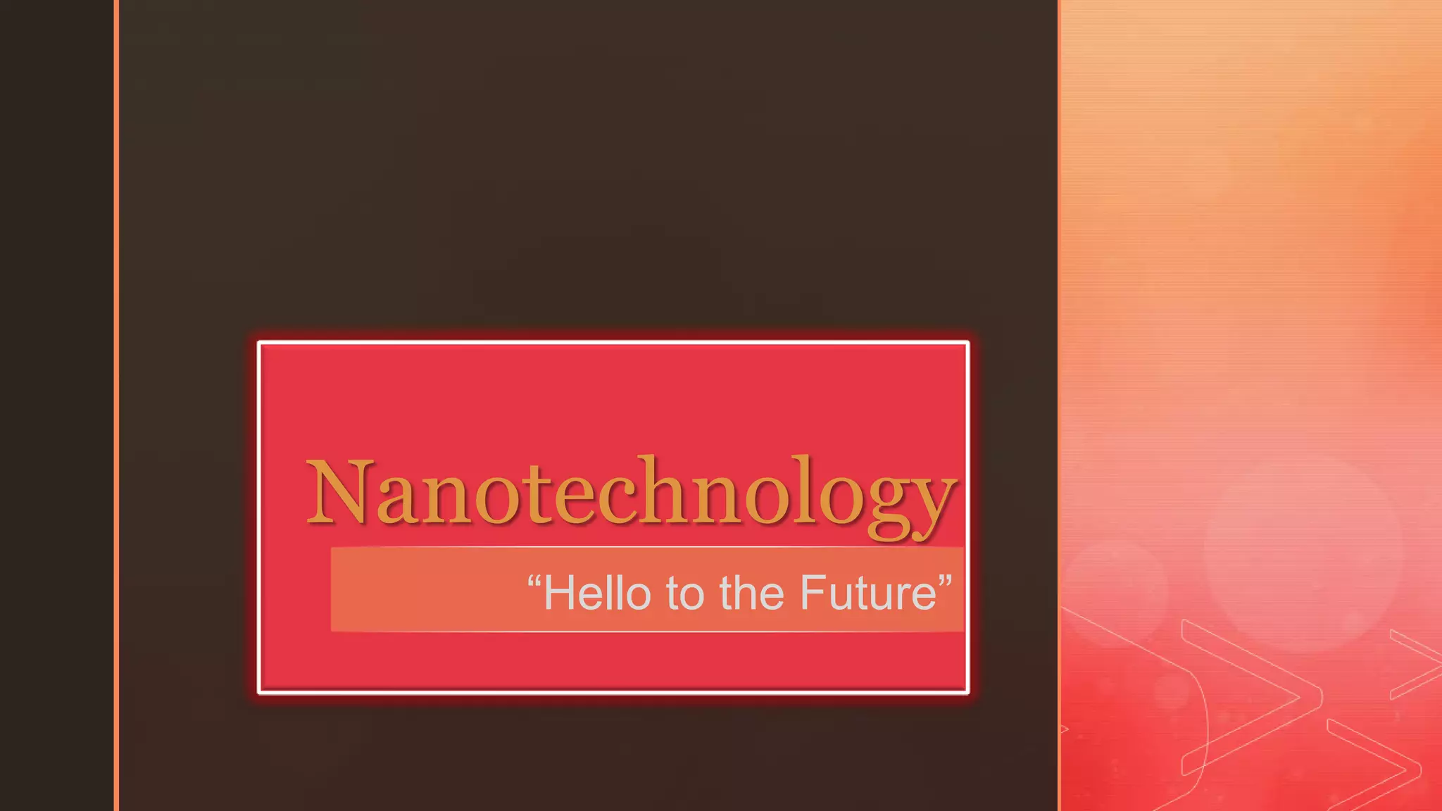 Nanotechnology refers to the control and manipulation of matter at the atomic and molecular scale. It involves working with structures sized between 1 to 100 nanometers in order to create new materials and devices. Some key applications of nanotechnology include nanomedicine, where nanoparticles are used for drug delivery and imaging, and nanoelectronics, where nanomaterials like carbon nanotubes are used to build smaller computer chips and circuits. While nanotechnology promises advantages like more powerful and efficient electronics and materials, it also faces challenges regarding environmental and health impacts that need further study.