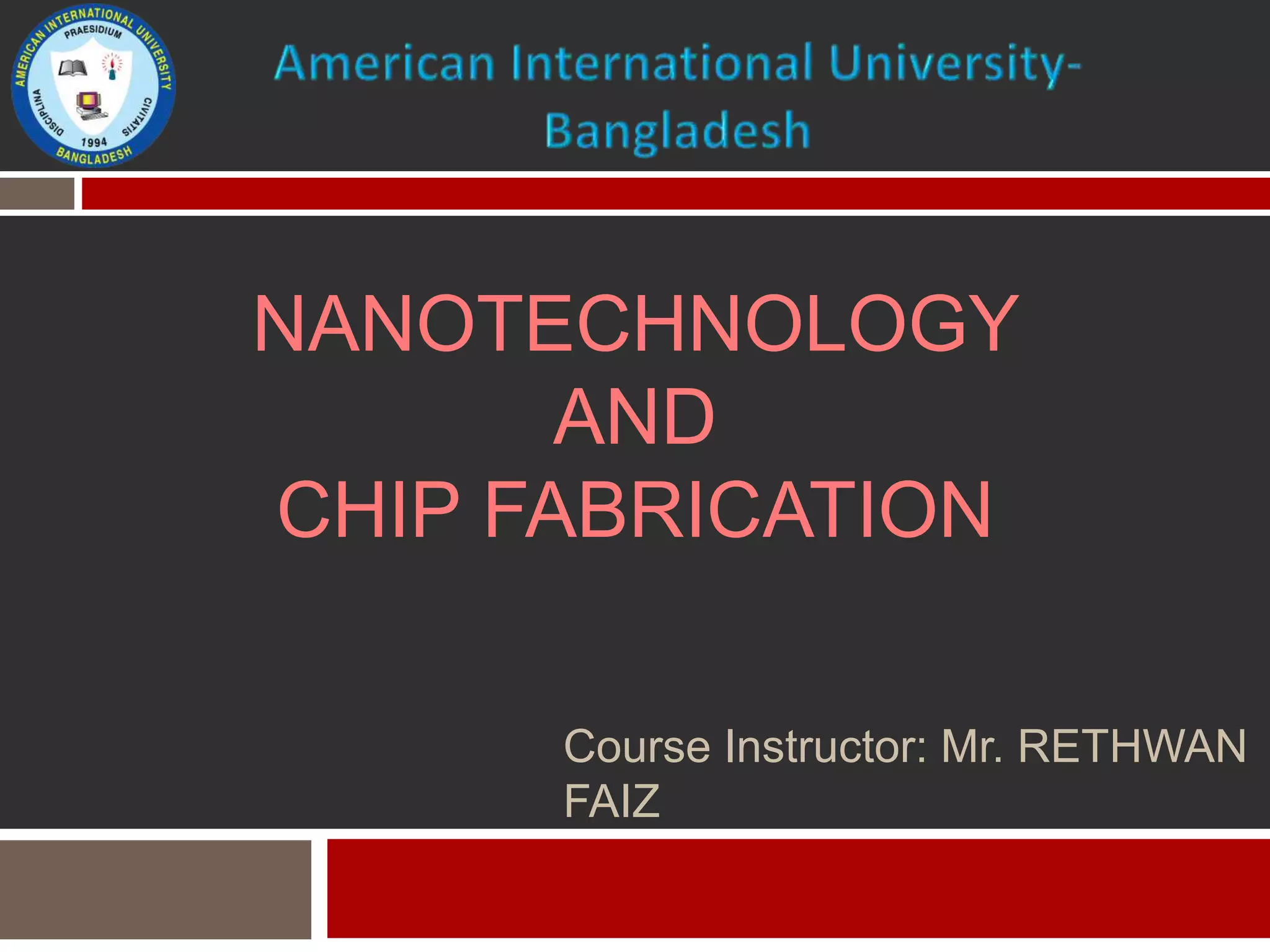 This document discusses nanotechnology and chip fabrication. It begins with an introduction to nanotechnology, noting that it involves creating materials and devices at extremely small scales of 1 nm or less. It then covers the history of nanotechnology, predicting its development by Richard Feynman. The document outlines the fabrication process for chips, including thermal oxidation, patterning, etching, doping, and finishing. It provides details on each step, such as how chemical vapor deposition is used for patterning and photolithography makes circuit patterns on chips. The summary concludes by mentioning Moore's Law about transistors doubling every two years.