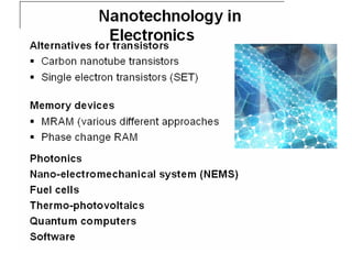 This document discusses the risks of nanotechnology related to soil, air and water pollution. It begins by outlining the objectives of understanding the nature and characteristics of nanoparticles, the manufacturing processes used and their byproducts, and how nanoparticles may behave in the environment. It then discusses some examples of consumer products containing nanoparticles and potential health issues if nanoparticles are inhaled, ingested or absorbed through skin. Environmental groups are concerned about a lack of research on nanoparticle impacts and the need for regulation and oversight of nanotechnology. In conclusion, while nanotechnology has potential benefits, new risk assessment and regulatory approaches may be needed to understand and mitigate potential negative environmental and health impacts.