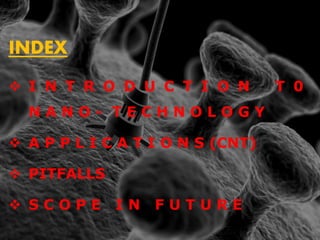 Nanotechnology involves manipulating matter at an atomic scale, with structures sized between 1-100 nanometers. Key applications include the use of carbon nanotubes in various fields like electronics, medical treatments, and energy solutions. While promising, nanotechnology also poses risks such as potential toxicity and military applications that could lead to dangerous consequences.