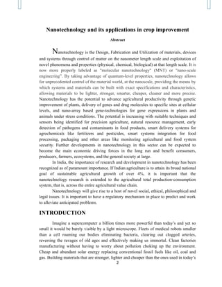 Nanotechnology has applications in crop improvement through genetic modification of plants, targeted delivery of genes and chemicals to cells, and nano-array technologies for regulating plant gene expression under stress. It can help with precision agriculture through sensors for soil/crop monitoring, smart delivery of fertilizers and pesticides, food processing/packaging, and security monitoring. Further developments in nanotechnology for agriculture are expected to be major economic drivers and benefit many stakeholders.