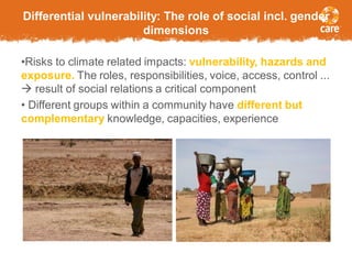 This document discusses considerations for integrating gender and vulnerable groups into national adaptation planning. It provides examples of tools used to conduct community-based vulnerability assessments, including seasonal calendars, hazard maps, and timelines. These tools aim to understand local impacts, facilitate community-led analysis and planning, and bring together indigenous and scientific knowledge. The document notes that disaggregating vulnerability analysis is important to understand differences in aspects like asset base, access to information, and division of labor. It also reflects on challenges of scaling up local analysis to the national level and balancing custom with inclusion. Recommendations include developing gender strategies, action plans, and indicators to better target adaptation interventions for vulnerable social groups.