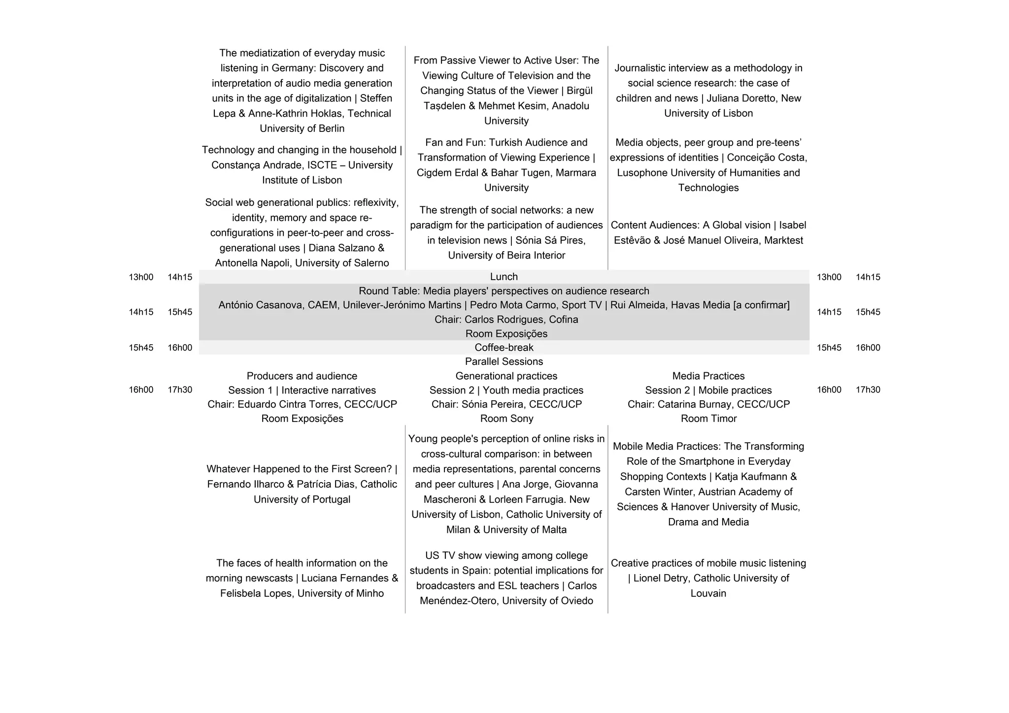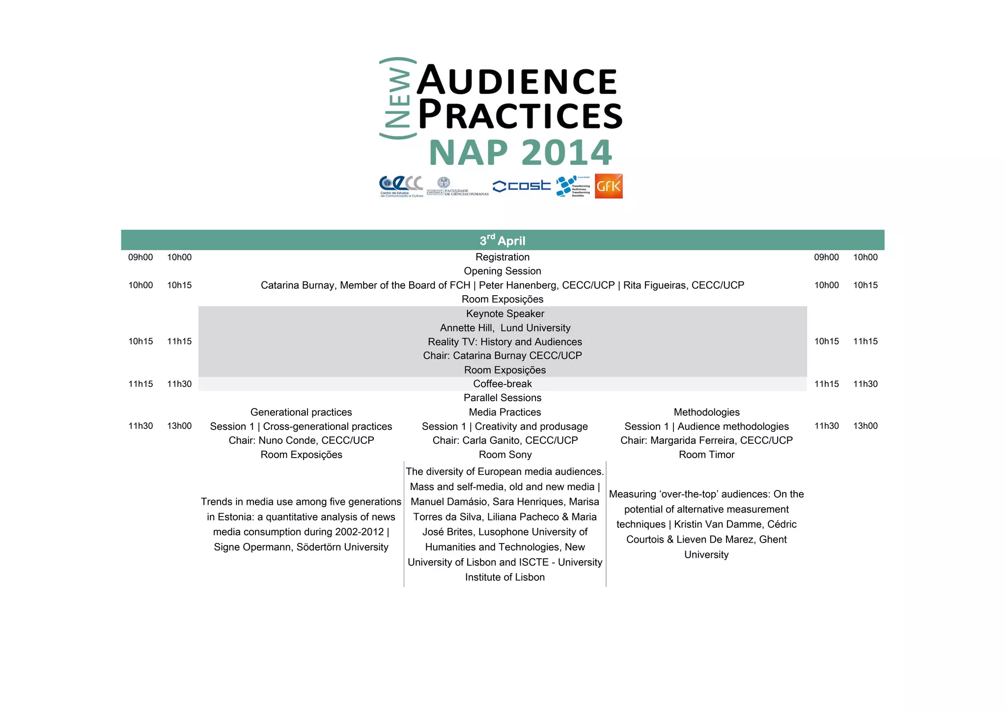 This document provides the schedule for a conference on April 3rd and 4th. It lists the keynote speakers, session themes, panel discussions, and individual paper presentations happening each day, including titles and presenters. The sessions cover topics related to audiences, generations, media practices, and methodologies.