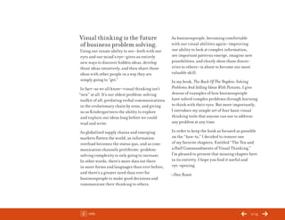 The document presents "The Ten and a Half Commandments of Visual Thinking," a chapter removed from Dan Roam's book The Back of the Napkin. It provides ten and a half tips for using visual thinking and visual tools to solve problems, including drawing a circle to get started, anthropomorphizing concepts, and using visual triggers to free up cognitive capacity. The tips encourage sketching aloud and erasing loudly to replace words with images.