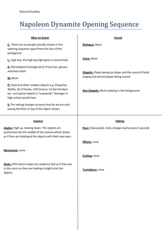 The opening sequence of Napoleon Dynamite uses a series of static shots from a high angle POV to slowly introduce various stereotypical items that belong to the protagonist, without any people, dialogue, or camera movement. The lighting is high key to look natural, and the only sounds are plates, birds, and pencils to set the scene.