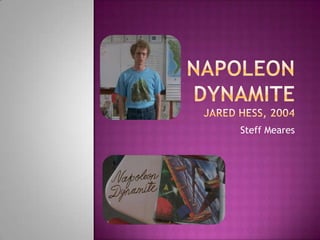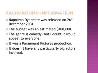 The document provides background on the 2004 comedy film Napoleon Dynamite. It had a low budget of $400,000 and was produced by Paramount Pictures. The opening credits sequence lasts over 3 minutes, an unusually long time. The first shots introduce the central protagonist Napoleon, who is shown to be a geeky outcast based on his clothes and awkward demeanor. While his strange behavior and appearance elicit laughs, the opening scene does little to set up the plot or give a sense of what will happen later in the film.