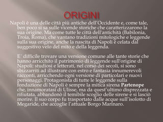 Napoli è una delle città più antiche dell'Occidente con origini avvolte nel mito, e la sua leggendaria fondazione è legata alla sirena Partenope. Il comune, con il sindaco Luigi De Magistris, rappresenta e promuove la comunità e il turismo è diventato un'importante risorsa economica grazie all'ospitalità dei napoletani. La cucina, con la celebre pizza napoletana, ha radici storiche antiche e dal 2010 è riconosciuta come specialità tradizionale garantita.