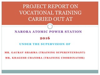 Rajkumari completed a summer training program at the Narora Atomic Power Station (NAPS) in Uttar Pradesh, India. NAPS uses pressurized heavy water reactors fueled by natural uranium to produce 220 MW of electricity each through nuclear fission reactions. Rajkumari's report describes the key components and systems at NAPS including the reactor, turbine, electrical distribution, and safety systems.