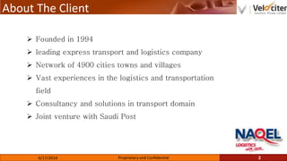 The document discusses a logistics company called NNAQEL Logistics that was founded in 1994 and has a network of 4900 cities and villages. It outlines the client's requirements to revamp their website, remove manual transactions, create a shipment tracking system, develop APIs for third parties, and allow electronic booking. The company helped the client by developing an online tracking system, resource center, API for integration, booking system, and customer analysis tools. This benefited the client by improving their online services and capabilities. Technical details are provided on the system architecture and snapshots of the new system.