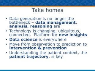 The document discusses the evolution of data management and its implications in healthcare, emphasizing the importance of understanding patient trajectories for improved outcomes. Key insights include the transition from data generation to data analysis and the emergence of population health analytics and eHealth biomarkers. The application of machine learning in healthcare aims to enhance decision support, monitor patient conditions, and facilitate preventive measures.