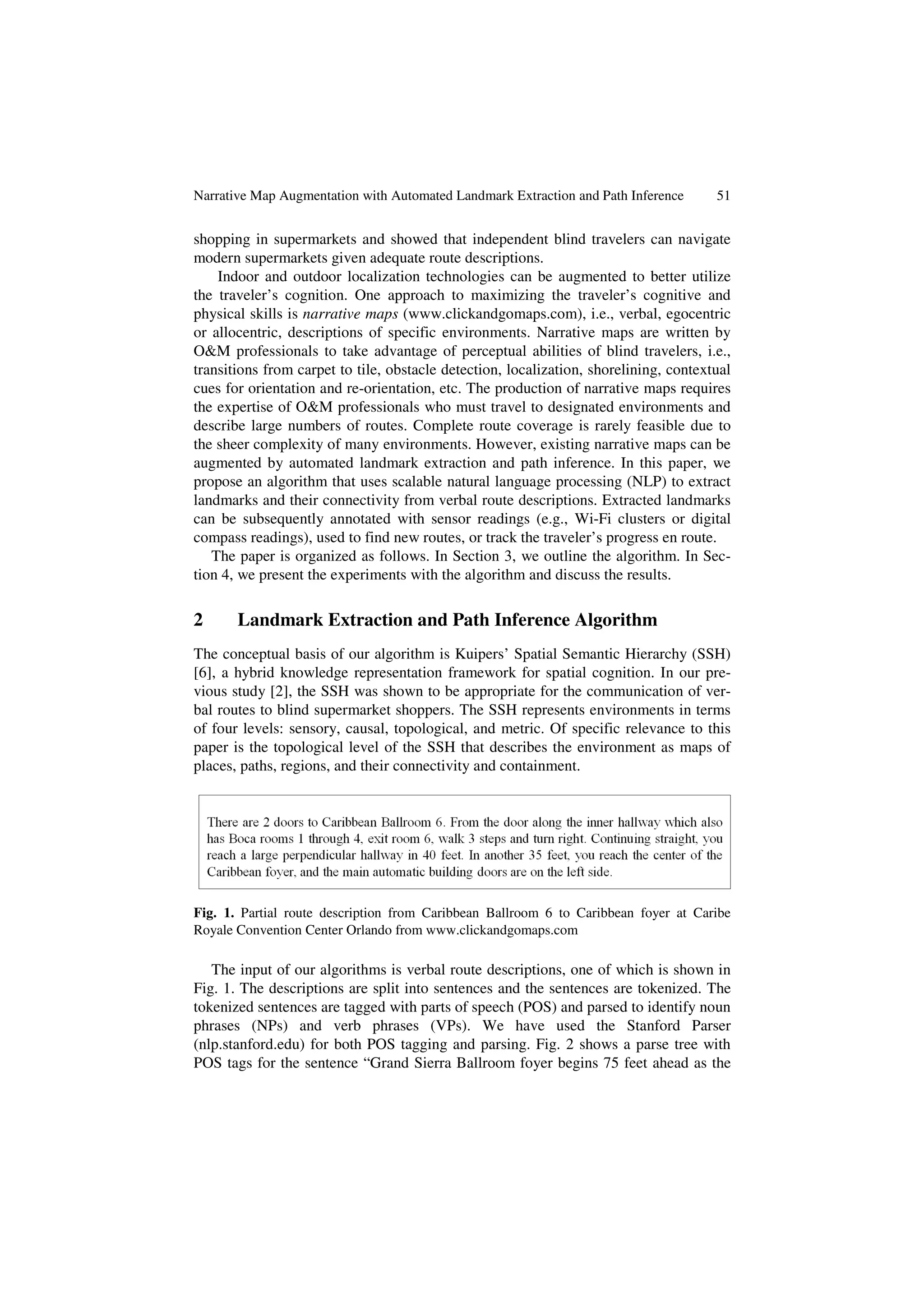 This document proposes an algorithm to augment existing narrative maps for blind travelers with automated landmark extraction and path inference. The algorithm uses natural language processing techniques to extract landmarks and connectivity information from verbal route descriptions. It analyzes sentences, identifies noun phrases as landmarks, and verb phrases to extract actions and connectivity between landmarks. The algorithm was tested on 272 route directions, extracting 421 landmarks and 884 connections with high accuracy. It also inferred 2,210 new potential paths between landmarks.