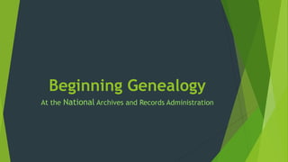 The National Archives and Records Administration (NARA) is responsible for preserving important government records and making them accessible to the public. NARA's website, Archives.gov, contains many genealogical records like census, military, immigration, and naturalization records. For beginning genealogists, NARA recommends starting with census records which are accessible on Archives.gov and can be searched by year from 1790-1940. The site also contains tutorials, FAQs, forms and charts to help genealogists in their research.