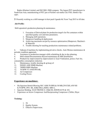 Narayan Kumar is seeking a position that values both career and personal goals. He has an MBA in operations management and a BSc in chemistry. His experience includes over 7 years as an officer and production engineer for PET manufacturing companies in India. Currently, he works as a shift manager in Uganda, overseeing operations, maintenance, and production planning. He is proficient in several injection molding and blowing machines. His achievements include achieving maximum production in a shift and assisting with new equipment commissioning.