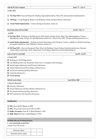 Narayan Singh Gour is seeking a senior management role in SEO/SMO with over 5.7 years of experience. He has expertise in on-page and off-page SEO optimization, content marketing, link building, social media marketing and managing a team of SEO professionals. Some of his clients include montcalm.co.uk, bagittoday.com and box.com where he has helped rank their websites for competitive keywords. He holds an MCA degree from RGPV Bhopal and has worked with various companies optimizing their websites and growing organic traffic.