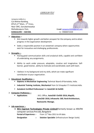 The document is a curriculum vitae for Narayana Reddy M.C. It summarizes his personal and professional details in 3 paragraphs or less. Narayana Reddy has over 10 years of experience working as a Solution Specialist and CAD Engineer. He has a Diploma in Mechanical Engineering and is Autodesk Certified in various software like AutoCAD, Civil 3D, and Infraworks. Currently he works as a Solution Specialist providing training and support for Autodesk's Infrastructure Design Suite.