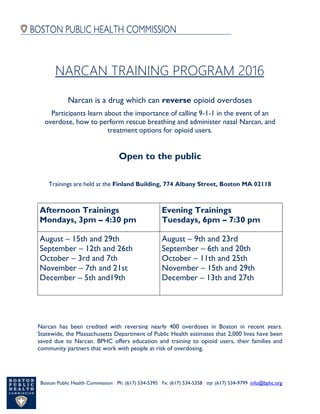 The document provides information about Narcan training programs offered by the Boston Public Health Commission to teach participants how to recognize and respond to opioid overdoses. The trainings cover administering nasal Narcan to reverse overdoses, performing rescue breathing, and treatment options for opioid users. They are open to the public and held on various weekday afternoons and evenings in Boston. Narcan has successfully reversed hundreds of overdoses in Boston and thousands across Massachusetts.