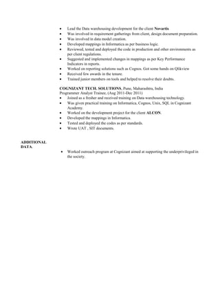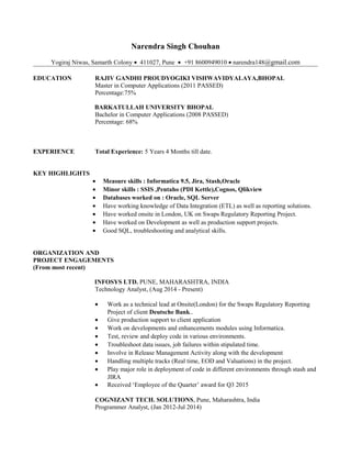 Narendra Singh Chouhan has over 5 years of experience working as a technology analyst and programmer analyst. He has extensive experience working with tools like Informatica, Jira, Stash, Oracle, SSIS, and Pentaho for data integration and reporting. Currently he works as a technical lead at Infosys providing production support and developing enhancements for a client using Informatica. Previously he led data warehousing development projects at Cognizant for clients like Novartis and ALCON developing mappings in Informatica, testing code, and creating documentation. He has received several awards for his work over his career.
