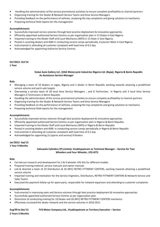 Narendra Kumar Thaduri has over 12 years of experience in after sales operations, service marketing, and channel management in the automobile industry in India and Nigeria. He is currently the Regional Service Manager for East, South, and Pan Nigeria at Dubai Auto Gallery LLC, where he manages dealers and oversees service operations. His expertise includes implementing service plans, exploring business opportunities, managing technical support, and ensuring high levels of customer satisfaction.