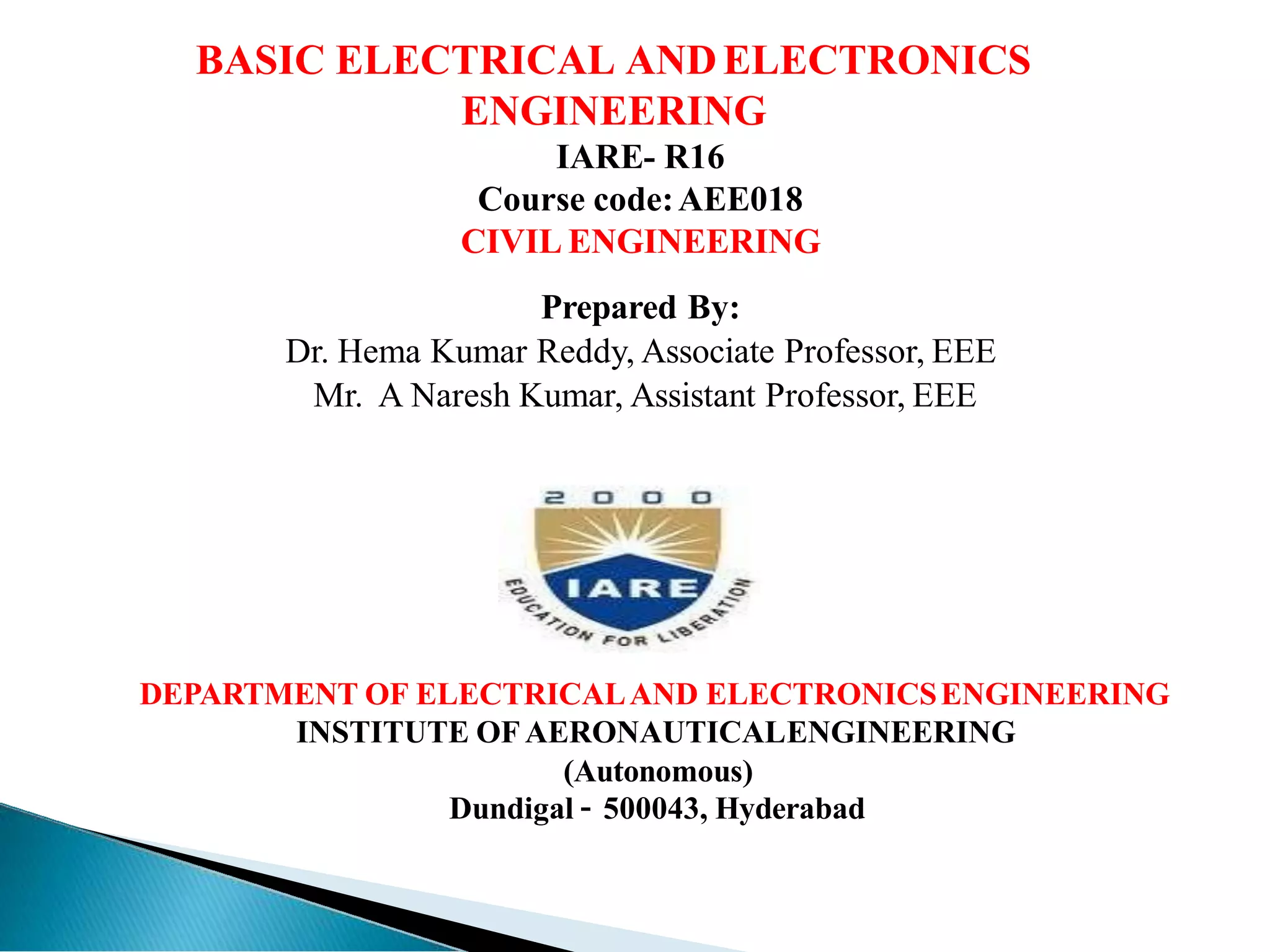 This document provides an overview of basic electrical and electronics engineering concepts. It begins by defining common units like the meter, kilogram, second, and ampere. It then discusses electric circuits, electromagnetism, and various instruments. Key concepts covered include Ohm's law, Kirchhoff's laws, series and parallel circuits, and the different characteristics of common circuit elements like resistors, voltage sources, and current sources. Measurement instruments are also introduced.