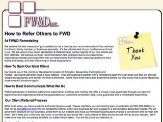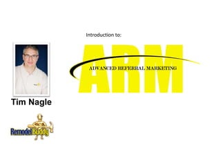 The document discusses marketing strategies for small businesses, focusing on generating referrals. It emphasizes narrowing your focus to an ideal client profile, differentiating your business, enhancing the customer experience, educating clients, and making referrals a core part of your business culture. Specific tactics mentioned include developing a marketing kit with your story, services, testimonials and case studies; creating memorable completion experiences for clients; and holding client showcase events to generate referrals. The overall message is that referrals are a powerful marketing strategy if businesses understand their customers and focus their efforts.