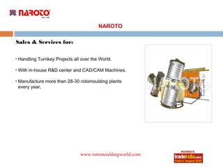 Naroto is an ISO 9001:2008 certified company that specializes in providing international standard rotomoulding plants and machines, producing 28-30 units annually. The company offers a range of products including rotational moulding machines and plastic pulverizers, featuring user-friendly designs and high operational efficiency. Their services include handling turnkey projects globally, with in-house R&D and a focus on quality and performance testing.