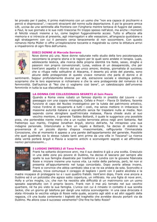 Il documento presenta una serie di brevi sintesi di romanzi contemporanei che esplorano temi di amore, perdita e identità. Le storie raccontano di incontri inaspettati, esperienze di vita difficili e riflessioni sulla memoria e il passato. Ogni racconto offre uno sguardo profondo sulle emozioni umane e sul complesso tessuto delle relazioni interpersonali.