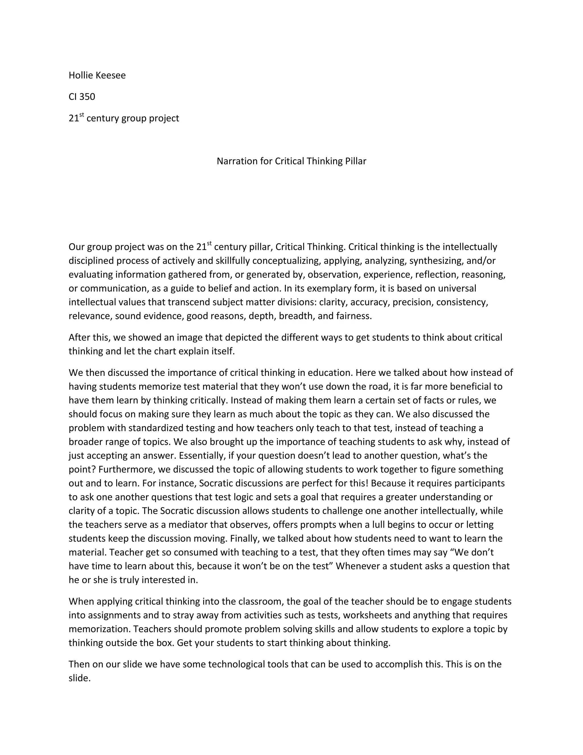 The document discusses critical thinking and its importance in education. It defines critical thinking as the intellectually disciplined process of conceptualizing, applying, analyzing, synthesizing, and evaluating information to guide belief and action. It then discusses using images and Socratic discussions to get students to think critically about topics by asking questions, challenging ideas and wanting to learn rather than just memorizing facts. The goal for teachers is to engage students in problem solving, exploration of topics, and thinking outside the box rather than focusing only on tests and memorization. Technological tools and specific classroom examples can help apply critical thinking.